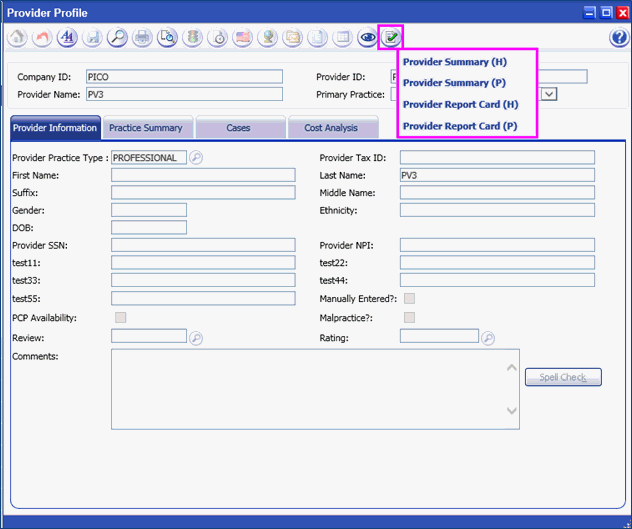 (The data in Provider Information, Cases and Cost Analysis are not editable)